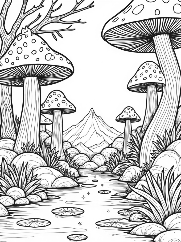 In this enchanting forest glade, you'll find towering mushrooms sprouting in all sorts of vibrant patterns, their caps looking like colorful kaleidoscopes. A winding river meanders through the scene, with floating lily pads shaped like stars adding a magical touch. Above, oversized leaves create a cozy canopy, showcasing intricate vein designs that are just waiting to be filled with color.