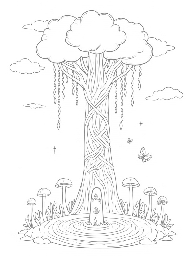 Imagine a towering tree with a trunk made of woven vines that looks like nature’s own masterpiece! Its branches flow down like a leafy waterfall, creating a dreamy atmosphere. Below, you'll find a circular pond that perfectly reflects the intricate patterns of the tree, making it look even more magical. Surrounding the pond are oversized mushrooms that look like colorful umbrellas, adding a fun twist to the scene.