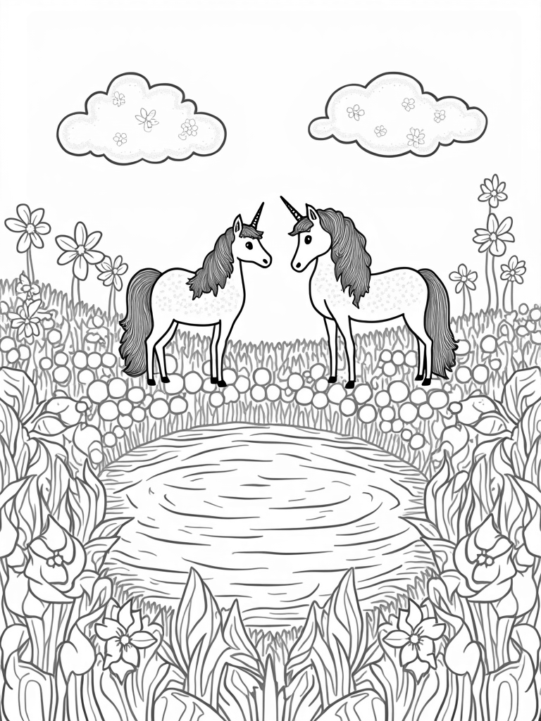 In the background, two lovely ponies stand side by side, their flowing manes fluttering in the breeze like ribbons. These graceful creatures are adorned with tiny stars and moons, adding a magical touch. As you color, you can bring these ponies to life with your favorite shades!