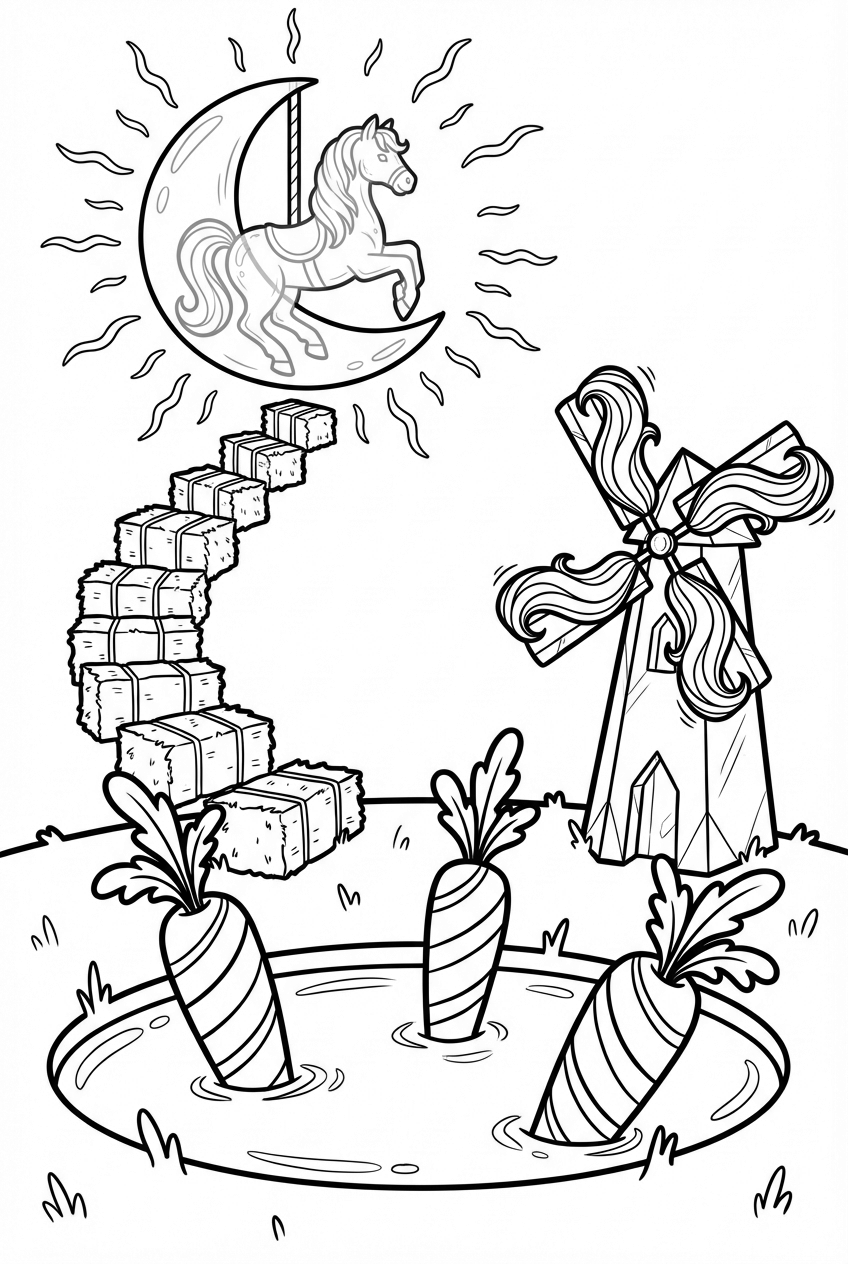 Look at this whimsical twilight meadow – a glassy pond pops with giant candy‑cane carrots sprouting like crazy. Above it, a translucent carousel horse floats like a full moon, spilling silver light onto a spiral staircase made of stacked hay bales. At the edge, a crystal windmill spins, its sails shaped like flowing manes. The whole scene is drawn in bold, playful lines, perfect for little hands to bring to life.