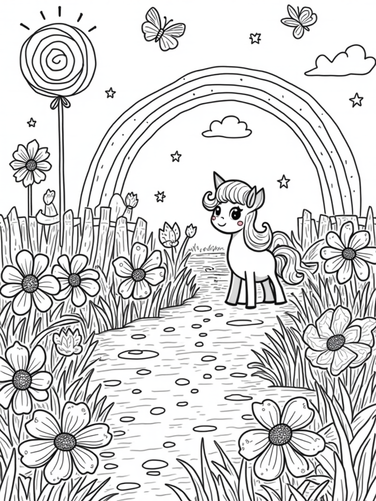 As you color, don’t forget to pay attention to the fluttering butterflies with their intricate wing patterns. They’re having a great time flitting around the giant sun-shaped lollipop that’s nearby. And let’s not miss the beautiful rainbow arching across the sky, adding even more color to this delightful scene.