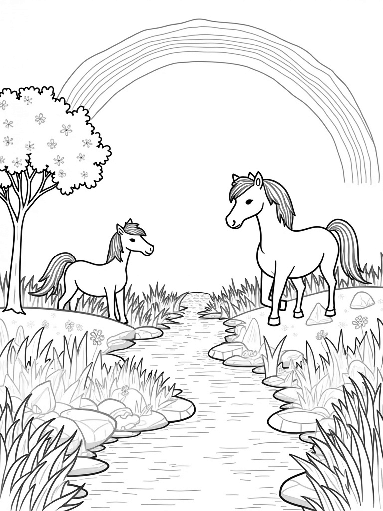 On one side of the scene, there’s a towering tree with a trunk that resembles a pony’s flowing mane. It provides a perfect shady spot for little ones to imagine their ponies resting. Plus, there’s a patch of grass that forms a natural corral, complete with fence posts that look like braided reins, inviting kids to color in their very own pony paradise!