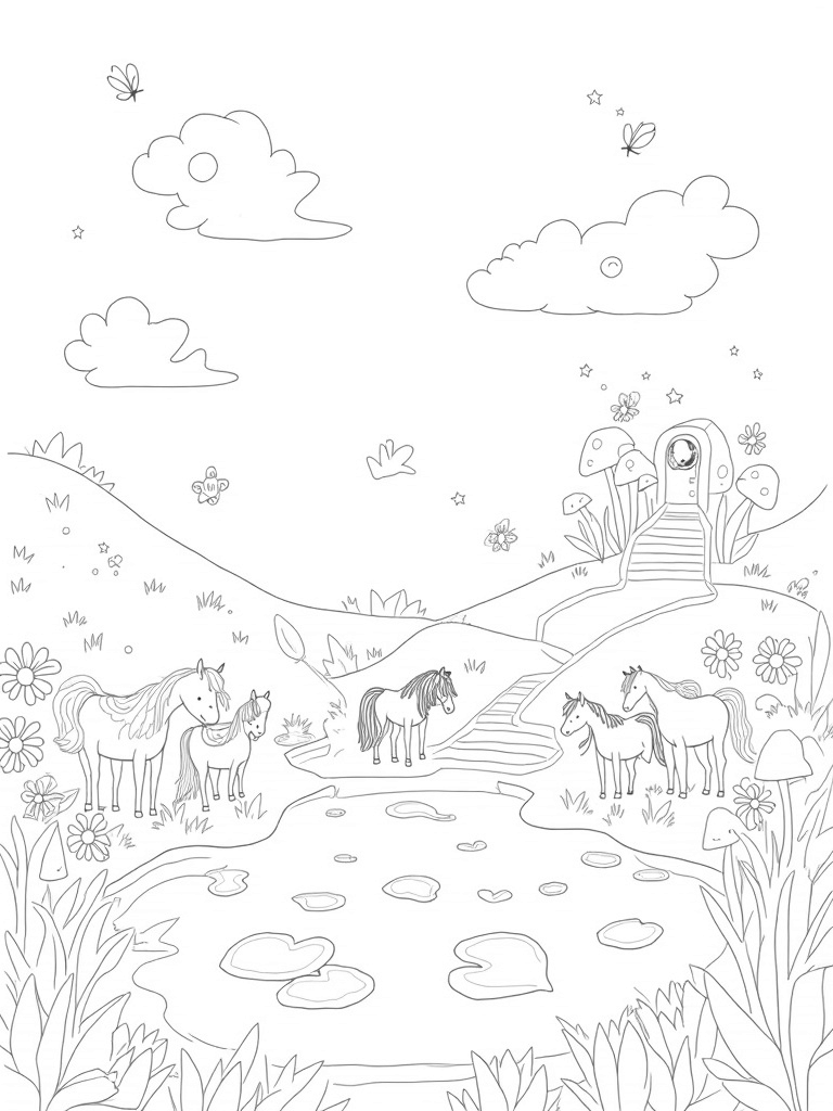Colorful Ponies in a Meadow with Giant Mushrooms Coloring Page
