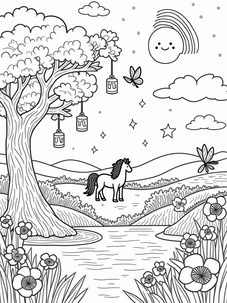 Look closely at the oversized flowers with their intricate petal patterns—they're just waiting for your creative touch! In the foreground, there's a large, twisting tree trunk that forms a charming archway, draped with twinkling lanterns shaped like stars. And don’t forget about the butterflies fluttering around, each with their own unique wing designs, making the scene feel alive and magical.