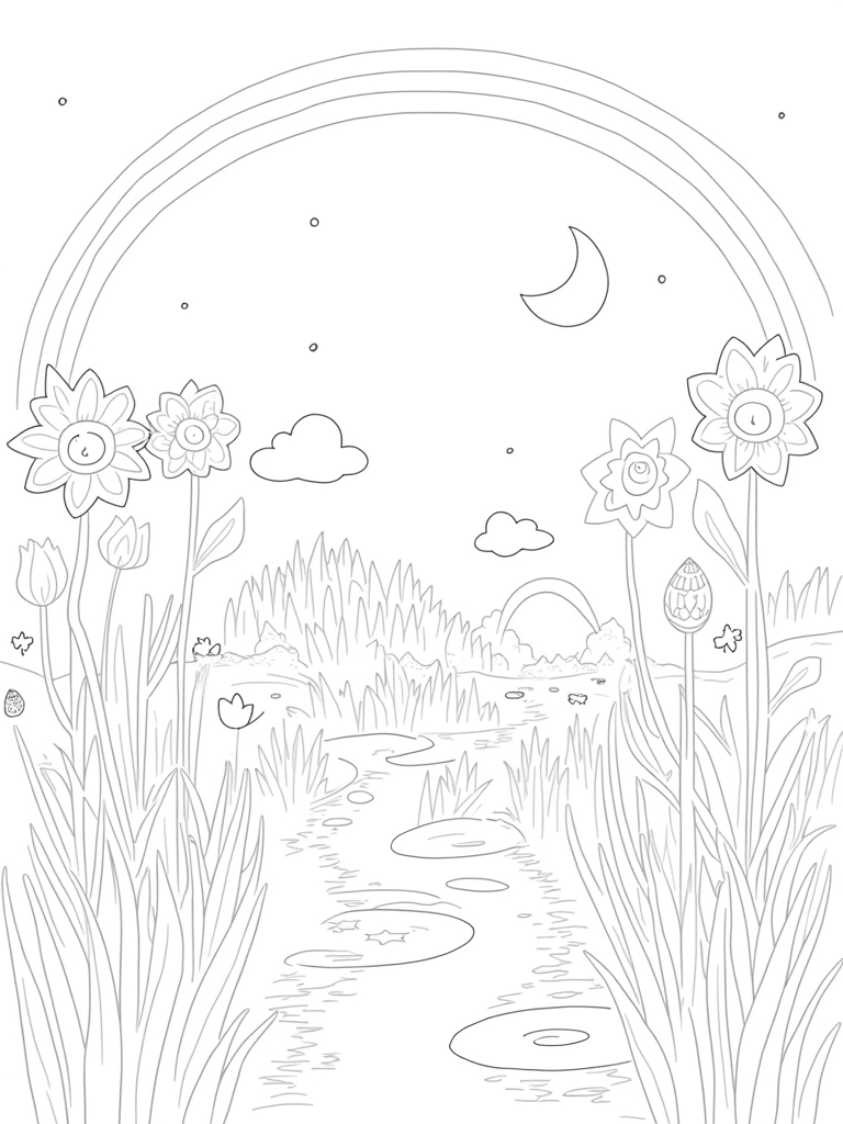 In the background, a giant rainbow arches gracefully over fluffy mountains made of soft clouds. It’s such a cheerful sight! And to top it all off, there’s a crescent moon hanging low in the sky, connected to the ground by a shimmering path of stardust. It’s a perfect spot for some creative coloring!