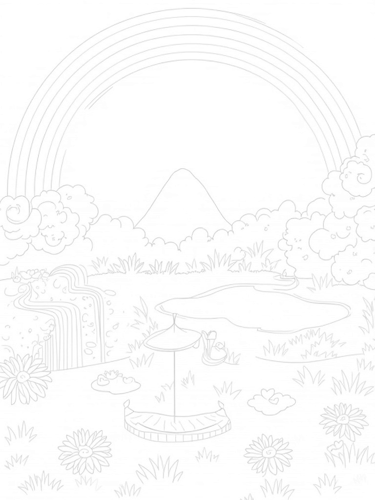 Look closely, and you’ll see a sparkling waterfall that flows into a pond shimmering with rainbow colors! The pond is dotted with heart-shaped lily pads just waiting for your favorite colors. And to top it all off, a giant rainbow arches across the sky, making everything feel even more cheerful!