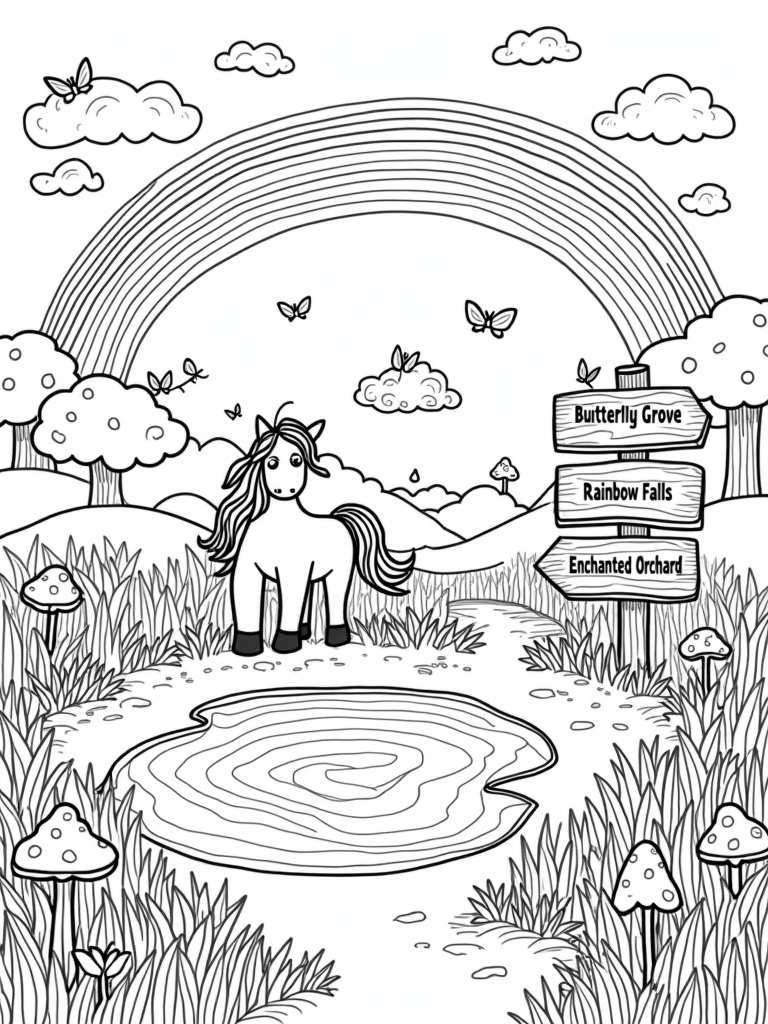 Nearby, a wooden signpost points to enchanting places like 'Butterfly Grove,' 'Rainbow Falls,' and 'Enchanted Orchard.' Each destination sounds like it could be straight out of a fairy tale! Kids can let their imaginations run wild as they color in this magical meadow, adding their favorite colors to each element.