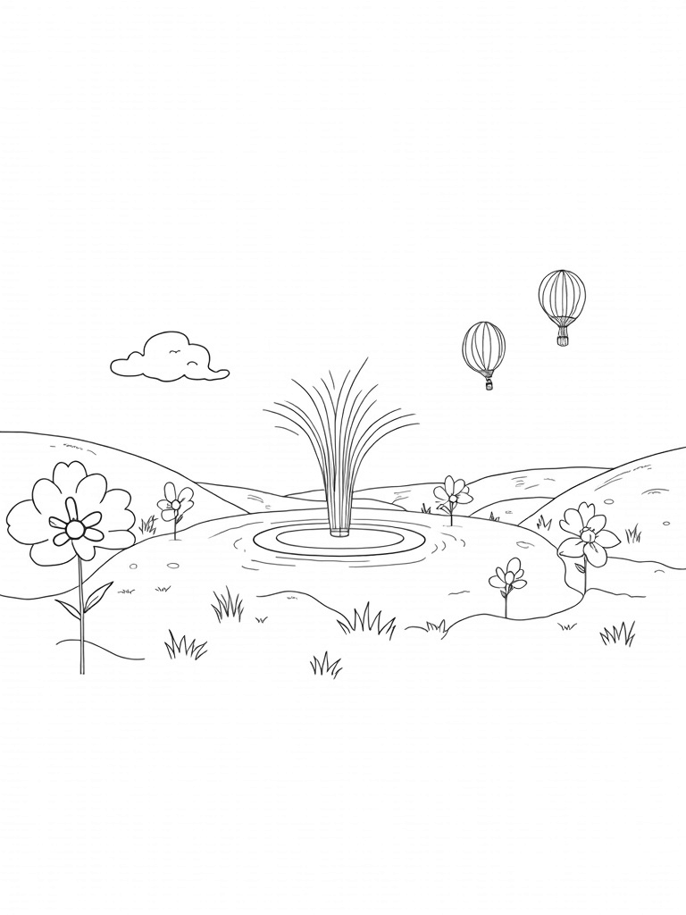This coloring page shows a magical garden bursting with oversized flowers that look just like playful pony silhouettes! At the center, a stunning rainbow fountain spirals up, pouring sparkling water into a peaceful pond below. Can you imagine how beautiful those reflections must be?