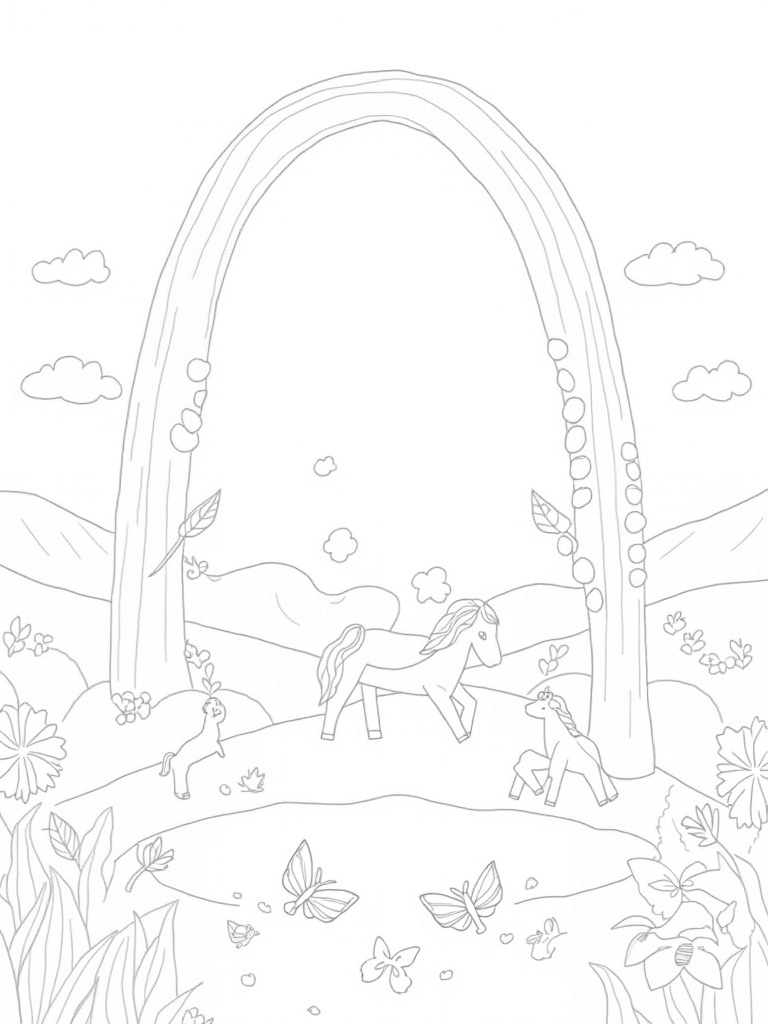 This coloring page is perfect for kids who love ponies, flowers, and all things colorful! With clean lines and plenty of details, it’s a fun way to express creativity. Grab your crayons or markers and let your imagination run wild as you color in the butterflies, flowers, and even the playful wooden ponies on the carousel. What colors will you choose for the rainbow?