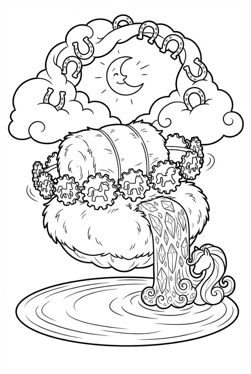 Did you know gear carousels were a thing in old steampunk fairs? They’re a fun nod to that retro‑future vibe. And the crystal waterfall isn’t just for looks – the way the water forms a mane gives kids a chance to blend pony hair patterns with splashing water. The moon’s glow is a great spot to practice shading, even though the line art itself stays bold and simple for easy coloring.