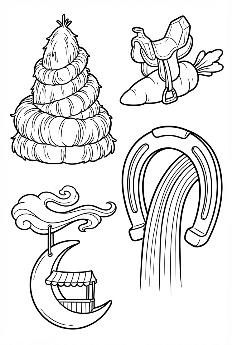 When you grab your crayons, think about the textures. The haystack’s rounded forms work great with warm yellows and golds, while the crystal saddle can shine with light blues or icy pinks. The floating carrot is a chance for a pop of orange, and the horseshoe arch can be a glittery silver or even a bright pastel. The waterfall is perfect for a rainbow gradient, and the cloud ribbon gives you a fluffy white or pastel sky backdrop.