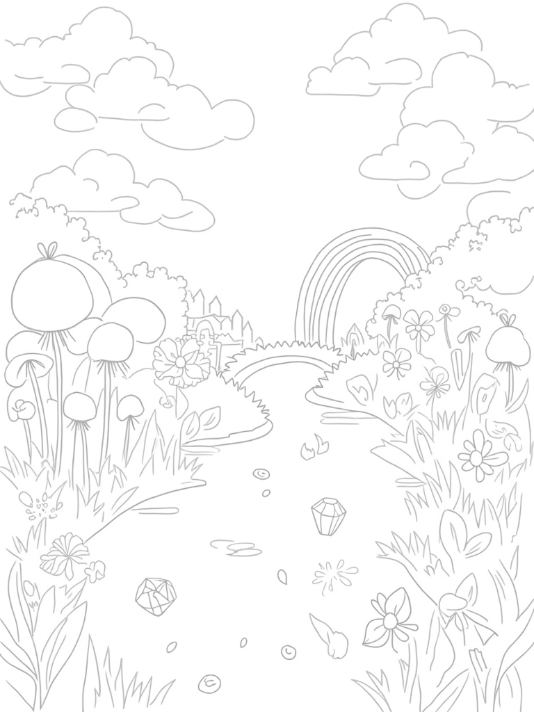 In this enchanting scene, you’ll find oversized flowers with petals that twist and turn like colorful pinwheels, adding a fun twist to your coloring experience. A gentle stream flows through the meadow, reflecting the sky above, where fluffy clouds take on the shape of playful ponies. If you look closely, you can spot giant mushrooms forming a whimsical archway on one side, while a rainbow bridge leads you to a distant hill topped with a sparkling crystal castle.