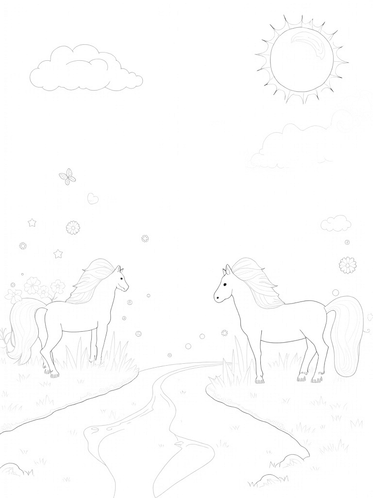 Check out this free, printable coloring page featuring a magical meadow filled with ponies and oversized flowers. Perfect for kids who love to color and explore their creativity!