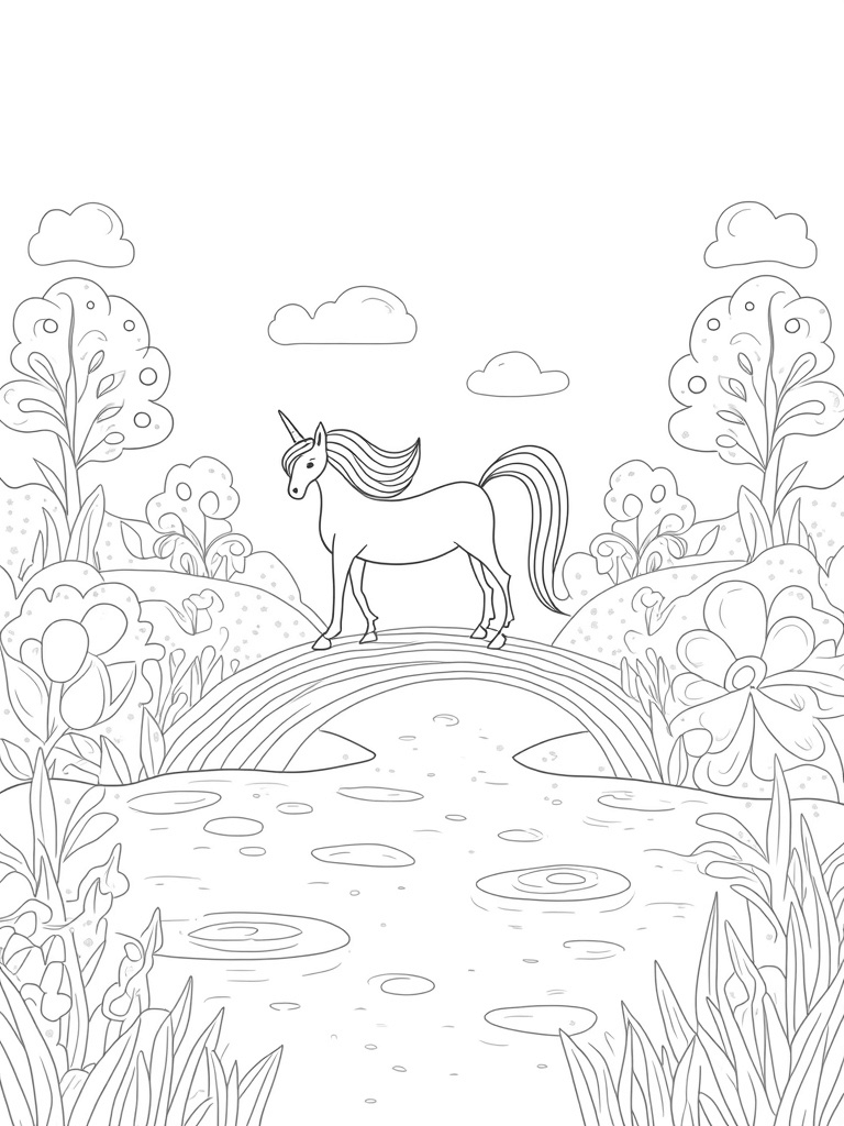 Next to the pony is a shimmering pond that reflects the most amazing galaxies. Imagine the colors dancing across the water! And let’s not forget the rainbow bridge that arches over it, decorated with intricate patterns that are just begging for some color. You’ll find it’s the perfect spot to let your imagination run wild!
