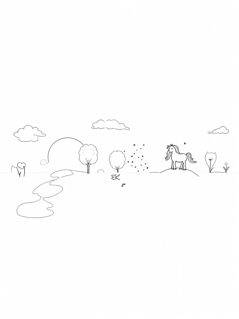 In this enchanting scene, a majestic pony stands proudly at the top of a hill, surrounded by oversized flowers that look like they’re ready to float away! The petals swirl gently in the breeze, adding a magical touch to the meadow. Floating musical notes sprinkle down like confetti, making it feel like a celebration of joy. Nearby, a sparkling stream winds through the lush grass, where smooth stones and delicate butterflies rest peacefully, soaking in the beauty of the day.