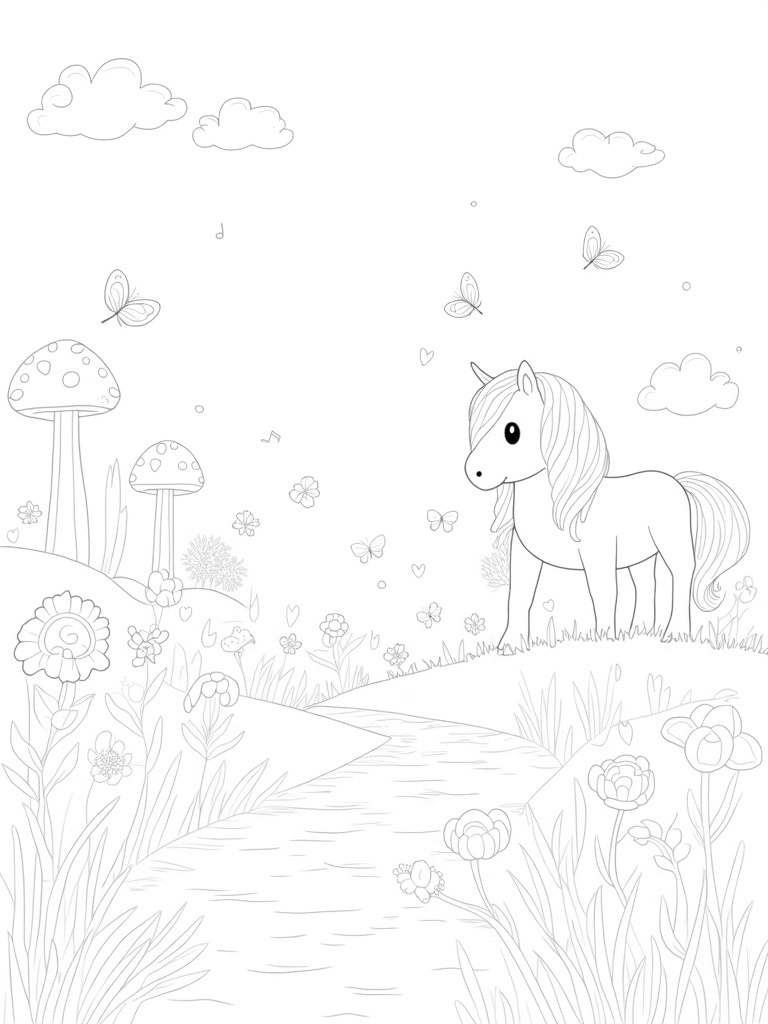 The star of this coloring page is definitely the majestic pony, with its flowing mane that looks like it’s catching the wind. But don't forget the other friends in this scene! The butterflies are vibrant and lively, making the whole meadow feel alive. And those towering mushrooms in the background? They add a playful, fantastical element that sparks the imagination!