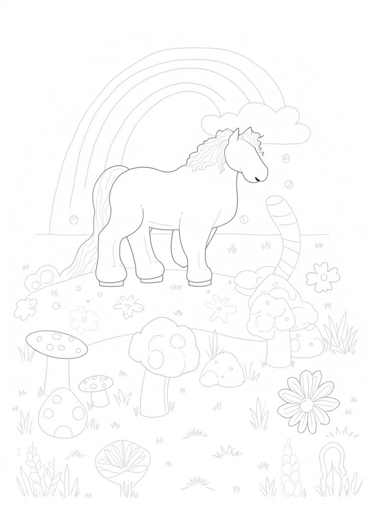 In this delightful scene, a majestic pony with a flowing, curly mane stands gracefully on a vibrant hill. Around the pony, oversized flowers swirl like candy canes, making the meadow feel like a magical wonderland. Towering mushrooms, covered in polka dots and stripes, add to the enchanting atmosphere, while a beautiful rainbow arches overhead, showering colorful droplets like gentle rain.