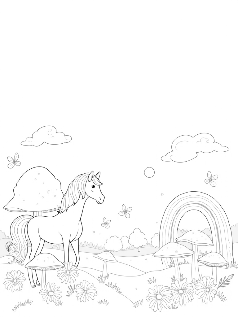 In this delightful scene, a majestic pony stands proudly on a grassy hilltop, its flowing mane dancing in the breeze. Surrounding it are oversized flowers bursting with vibrant colors and patterns, creating a joyful vibe. Nearby, a cluster of giant mushrooms forms a whimsical archway, inviting delicate butterflies to flutter around them. And if you look up, you’ll see fluffy clouds that look just like playful ponies, drifting lazily across a bright blue sky.