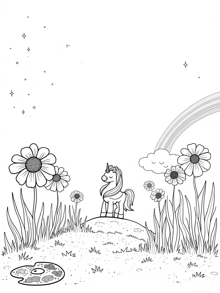 Nearby, there's a sparkling paint palette resting on the grass. Colorful splashes spill out like little rivers, adding even more fun to this magical scene. And if you look up, you'll see a rainbow stretching across the sky, ending in a twinkling cluster of stars that look like confetti. It's a place where imagination can run wild!