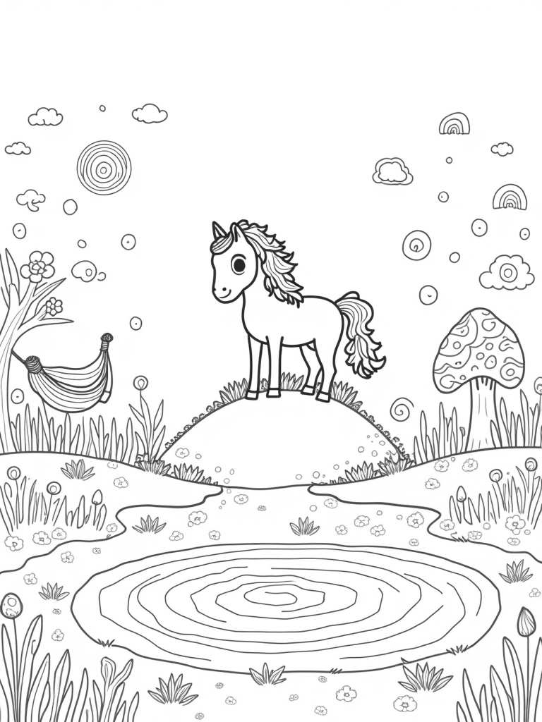 This scene is all about imagination! You’ll find a majestic pony right in the center, with a mane swirling with patterns that are just waiting for some colorful touches. The pony stands proudly on a hill, surrounded by playful bubbles that reflect tiny rainbows. Isn’t that magical?