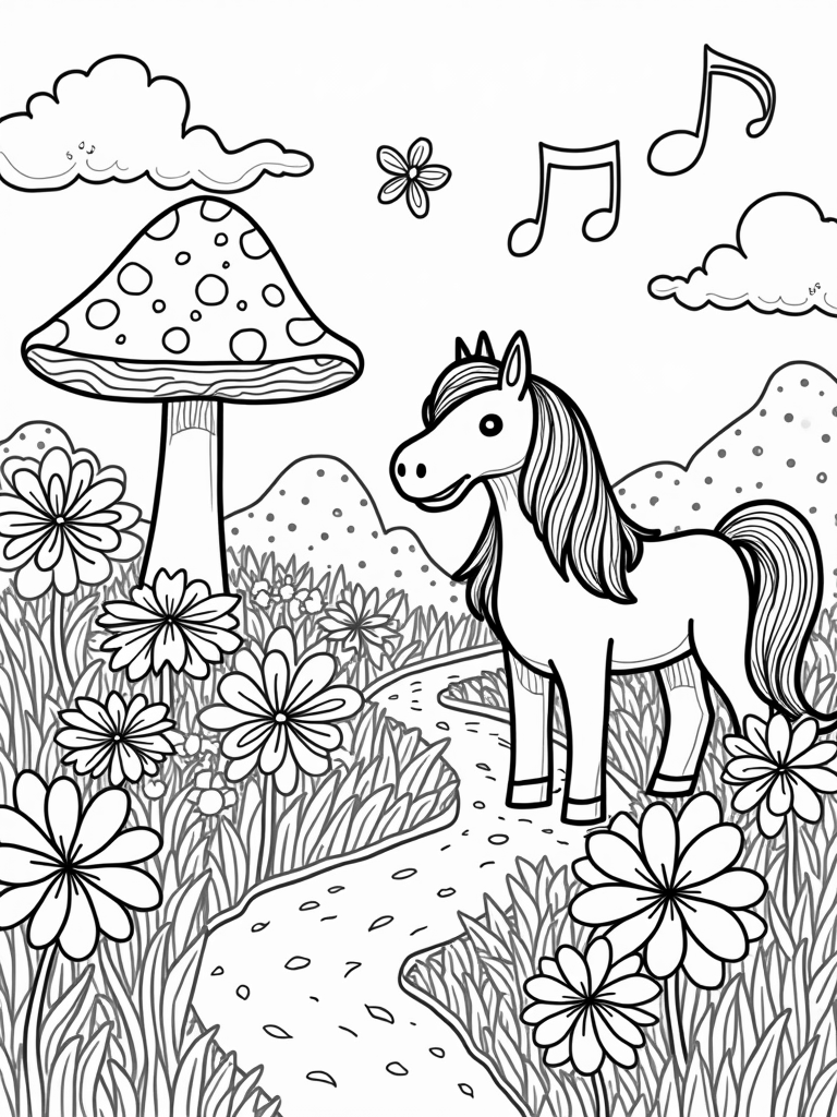 This scene captures a majestic pony standing proudly beneath a giant mushroom, its cap twinkling with stars. The meadow is bursting with oversized flowers, each petal playfully decorated with swirls and stripes. Nearby, a sparkling stream winds its way through the landscape, reflecting the bright sun and inviting colorful butterflies to dance around.