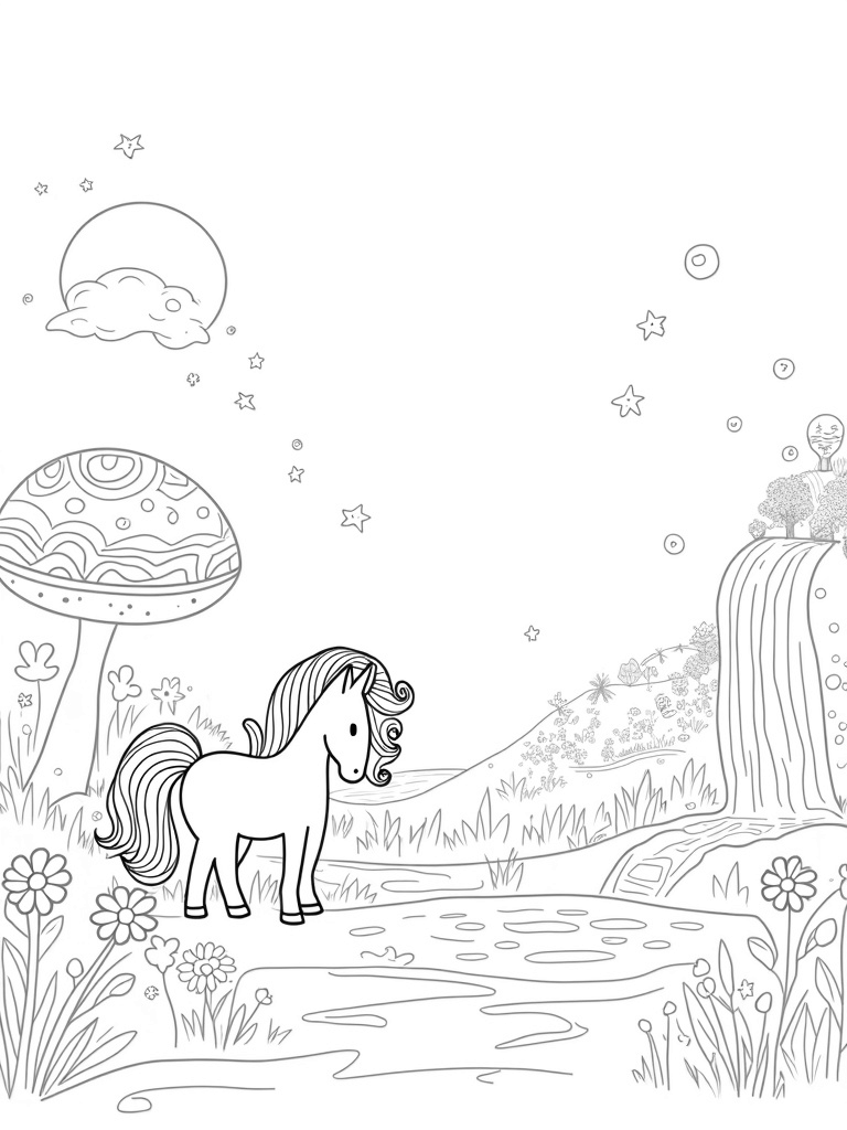 This delightful scene showcases a beautiful meadow bursting with oversized flowers in all sorts of vibrant colors. Right in the middle, there's a majestic pony with a flowing mane that spirals like a soft cloud. Next to the pony, you'll find a giant mushroom that looks like it jumped straight out of a fairy tale!