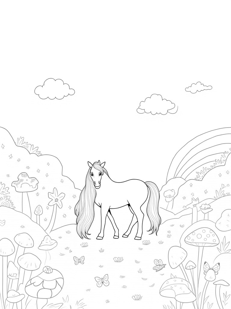 In the foreground, you'll find a patch of enchanted mushrooms, each cap adorned with intricate designs just waiting for your creativity. Nearby, a vibrant rainbow arcs gracefully over two hills, where playful butterflies flit about. There’s so much detail to color, making it a delightful scene for kids who love ponies and nature!
