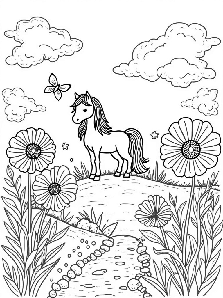 In this delightful scene, a stunning pony stands proudly on a hill, surrounded by a sea of oversized flowers that burst with colorful patterns. The pony's flowing mane is just as vibrant, swirling with fun designs that invite your imagination to run wild. Nearby, playful butterflies flutter around, adding a touch of magic to the meadow.