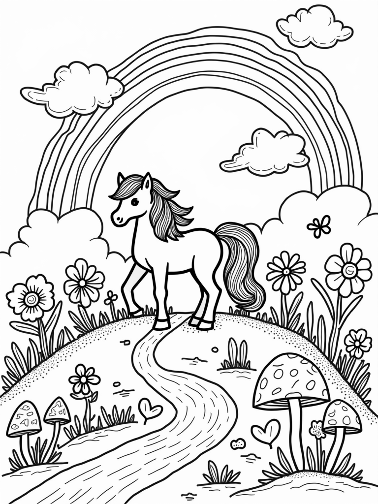 Above this enchanting garden, fluffy clouds take on the shape of galloping ponies, racing across the sky. A bright rainbow arches overhead, with each color section filled with intricate patterns for you to color in. It’s a perfect spot for a day of creativity!