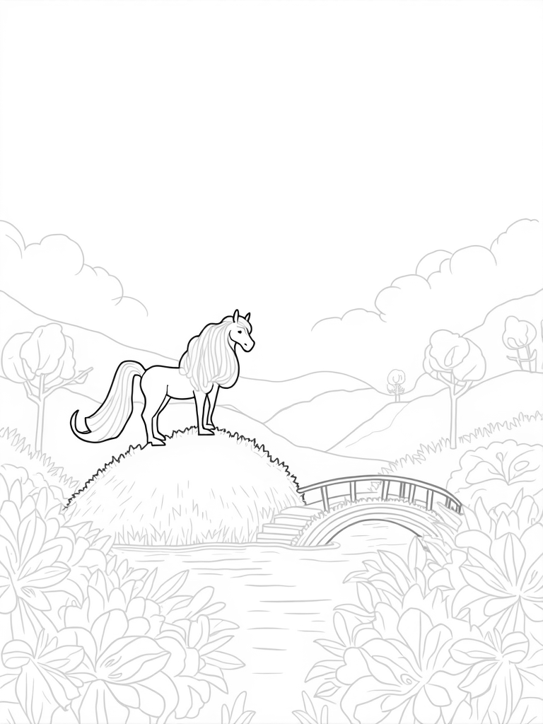 Here's a free, printable coloring page featuring a majestic pony in a whimsical meadow. Perfect for kids who love ponies and nature, this coloring page is sure to spark their imagination!
