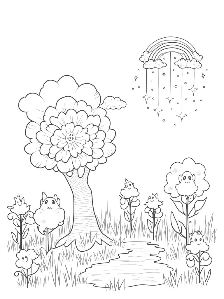You’ll find a magical meadow filled with flowers that look just like colorful ponies! Each big bloom adds a pop of color to the scene. At the center, a giant tree trunk swirls up to the sky, with branches covered in pony-shaped leaves. Can you imagine how cool that would be?