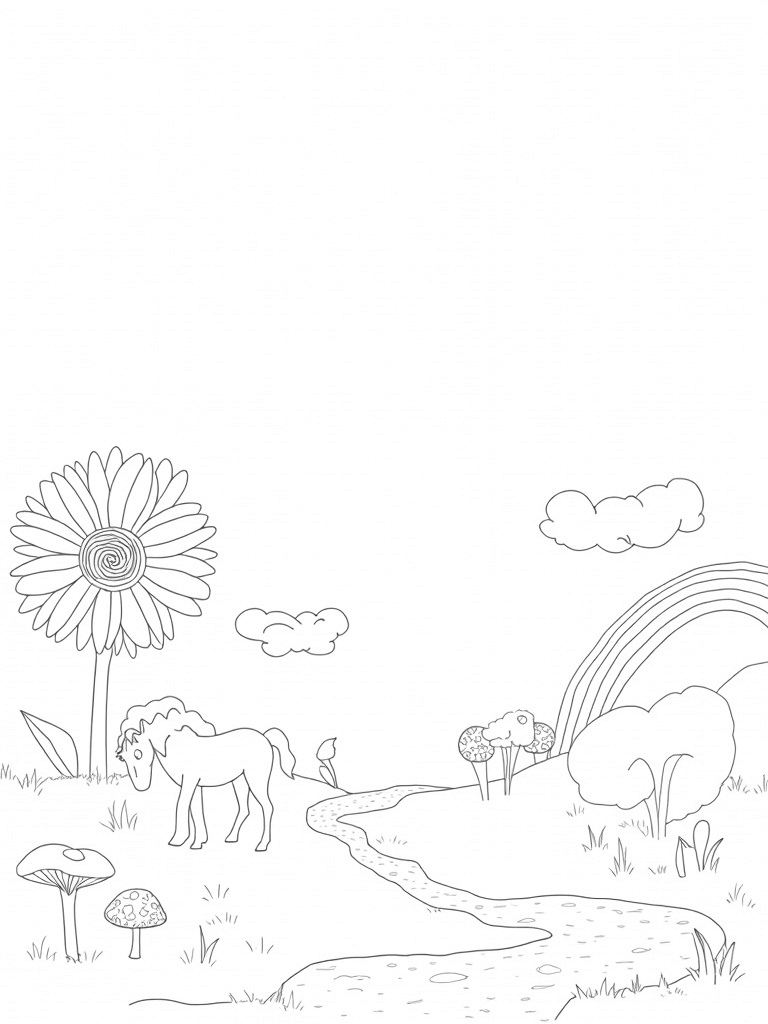 Just nearby, a bubbling brook flows with sparkling water, lined with heart-shaped stones that are just waiting to be colored in. The sound of the water adds a peaceful vibe to this magical place. Kids can imagine themselves splashing around in the brook while the ponies munch on the grass nearby.