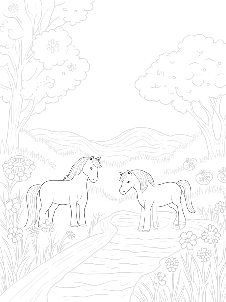 Grab your favorite coloring tools and let your imagination run wild! You can choose any colors you like for the ponies, flowers, and even the magical pond. There are no rules here—just fun and creativity waiting to burst forth!