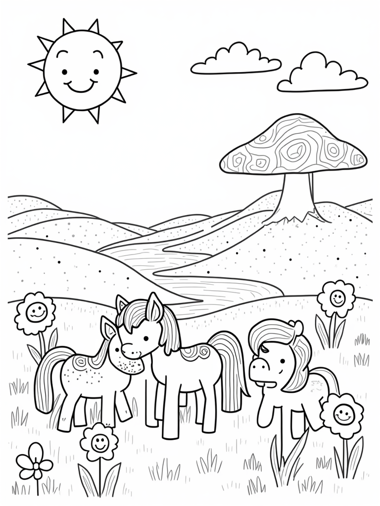 This scene is all about fun! In the foreground, you’ll see a bunch of playful ponies munching on grass next to a gigantic, vibrant mushroom. Each pony has its own unique patterns, making them all special in their own way. Just behind them, soft, rolling hills stretch out under a big, happy sun with a smile that could brighten anyone’s day!