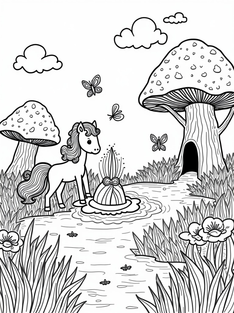 This delightful scene shows a playful pony with a flowing mane standing next to a sparkling rainbow fountain. The water cascades in gentle arcs, creating a magical atmosphere. Surrounding the pony are vibrant flowers and oversized mushrooms, adding pops of color to the whimsical meadow.
