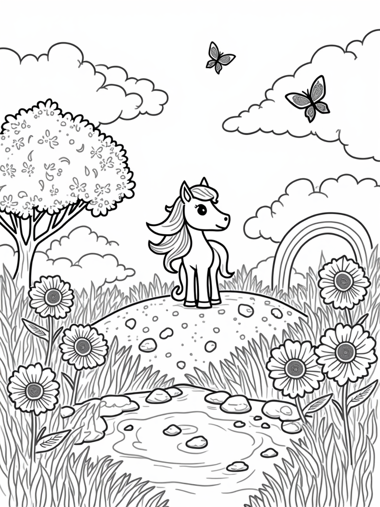 In this delightful scene, a joyful pony stands proudly on a hill, surrounded by giant daisies and cheerful sunflowers. The oversized flowers are just waiting for your favorite colors to bring them to life! Look at those swirling clouds overhead, adding a touch of magic to the sky.