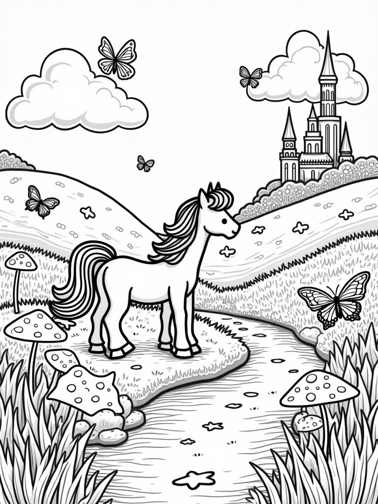 Check out this free, printable coloring page featuring a playful pony in a magical meadow. With oversized flowers, butterflies, and a candy castle, it's a delightful scene for kids to color and enjoy!