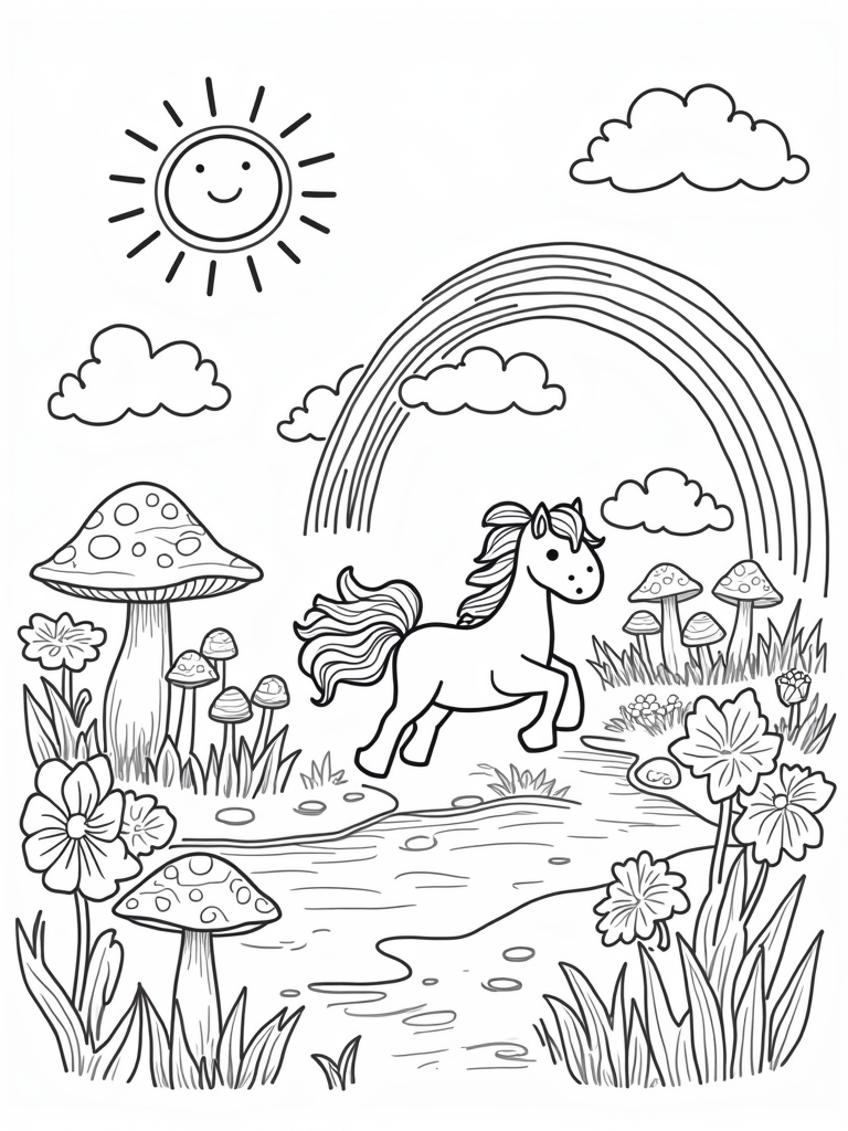 This cheerful scene showcases a playful pony with a flowing mane, happily leaping over a sparkling stream. Surrounding the pony are colorful, oversized flowers that sway in the gentle breeze, creating a delightful atmosphere. On one side, a cluster of giant mushrooms forms a fun playground, making it the perfect spot for some imaginative play.