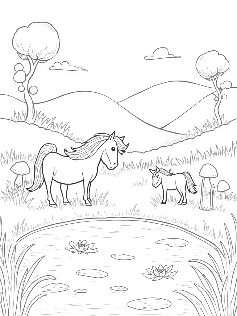 You’ll find a charming scene with adorable ponies grazing peacefully in a meadow filled with enormous, bright flowers. Their big, swirling manes are sure to inspire some colorful creativity! There's a sparkling pond nearby that reflects the fluffy clouds above, and those lily pads are so cute, resembling little clouds floating on the water.