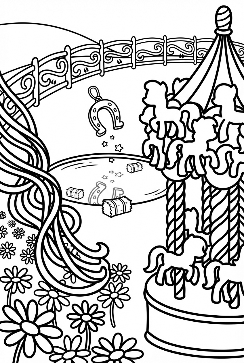 Take a look: a big carousel built out of pony silhouettes, each pole twisted like a candy‑cane. A ribbon waterfall swoops down in rainbow loops, spilling onto a meadow dotted with giant daisies. Hovering above a shiny pond is a silver horseshoe‑shaped locket, and the water mirrors a sky of star‑shaped hay bales. To the side, a chalkboard fence stretches across, covered in playful hoof‑print loops. All the lines are thick and bold, so it’s easy for little hands to stay inside the shapes.