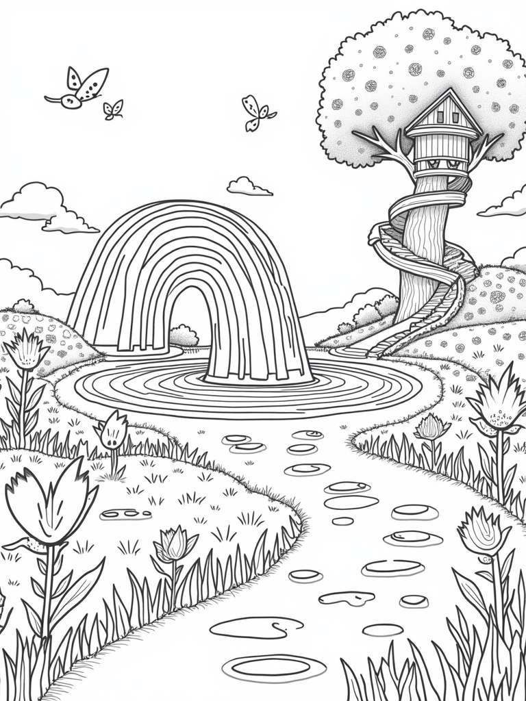 Imagine a colorful meadow bursting with oversized flowers, where each petal is shaped just like a pony hoofprint! At the heart of this magical scene is a swirling rainbow fountain, splashing vibrant water into a peaceful pond filled with lily pads. Nearby, a group of butterflies dances through the air, each with its own unique wing patterns, bringing a touch of whimsy to the patch of grass around them.