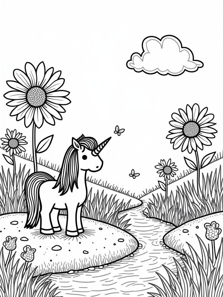 As you color, don’t forget about the butterflies dancing above. Their wings are decorated with intricate patterns, making them a joy to color in. And look at that fluffy cloud shaped like a heart floating overhead, casting soft shadows on the scene. It’s a perfect day in this magical meadow!