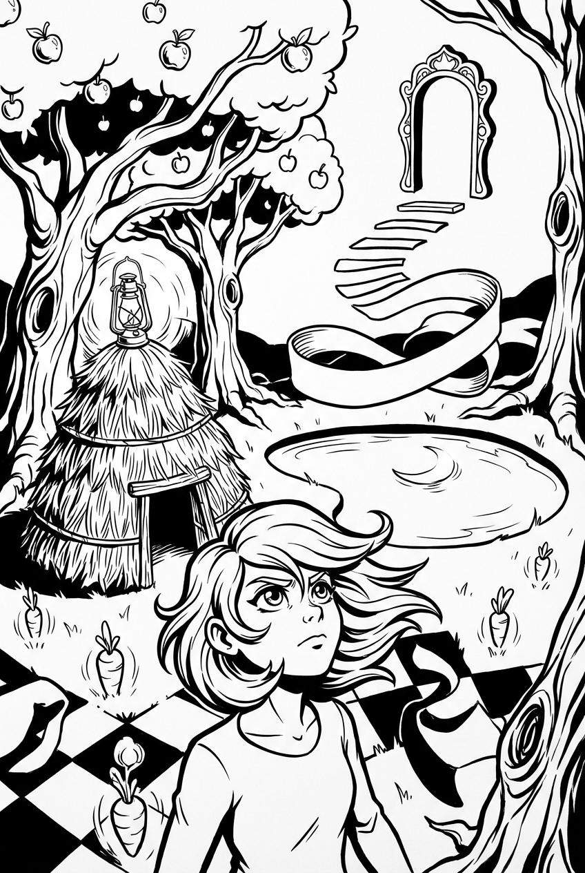 Imagine a marble‑smooth meadow dotted with gigantic candy‑apple trees, a haystack lighthouse glowing from a brass lantern, and a crystal pond that perfectly reflects a silver horseshoe‑shaped moon. Floating ribbons of mane twist up into a spiral staircase that leads to a dreamy floating saddle arch. The grass is laid out in checkerboard patches, and little carrot lanterns give off a soft glow as night falls.