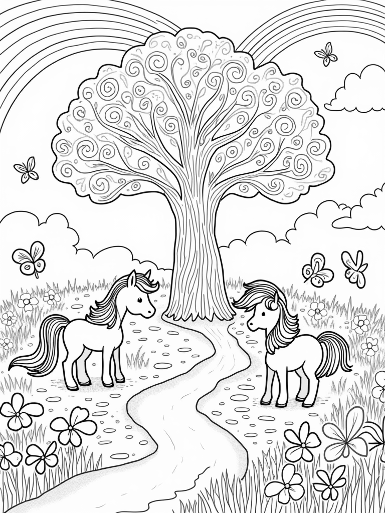 In this charming scene, colorful ponies with long, flowing manes are having a blast frolicking in a vibrant meadow. They’re surrounded by oversized flowers that look like musical instruments, bringing a fun twist to the garden! Look closely, and you’ll see a grand tree in the center, its spiraling branches filled with leaves that turn into musical notes, gently floating in the air.