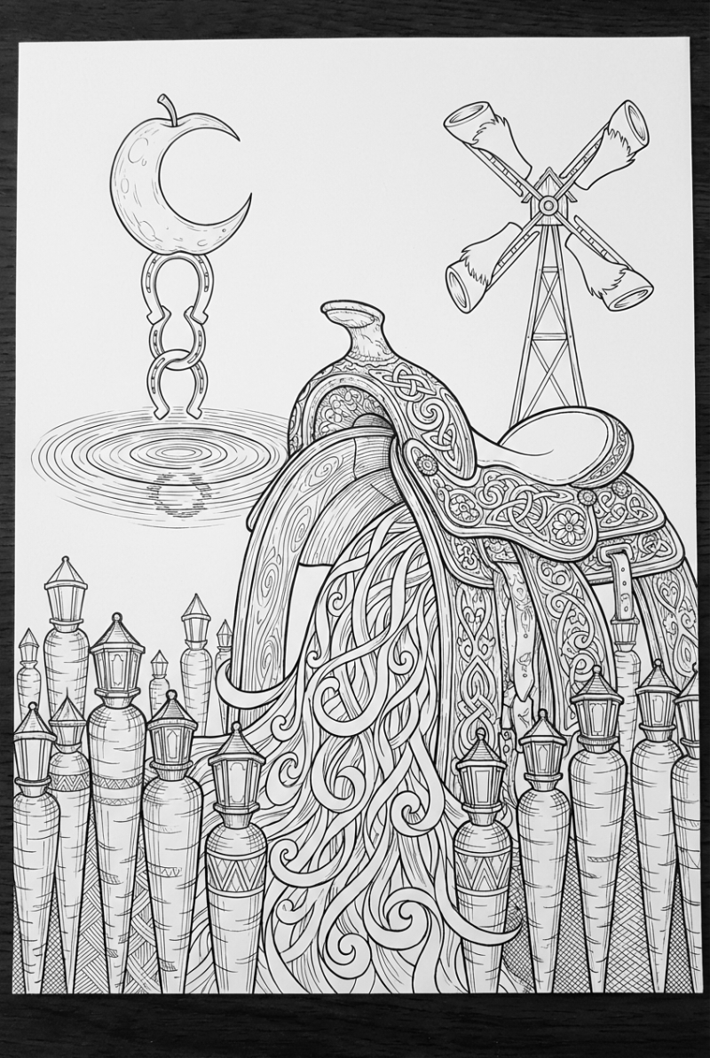 Look closely and you’ll spot a wooden saddle arch framing a waterfall made of shimmering ribbons. Around it stand giant carrot pillars, each perched with a tiny lantern crafted from pressed petals. Above a crystal pond floats an apple-shaped moon, its glow reflected by concentric circles of mirrored horseshoes. On the edge, a windmill spins with blades that look like pony hooves, adding a playful touch to the whole scene.