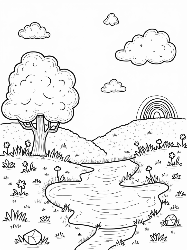 This scene is just waiting for your favorite colors! You can fill the sky with blues and pinks, make the river sparkle with shimmering colors, and choose any shades for the flowers. Let your imagination run wild as you bring this magical meadow to life with your crayons or markers. Don’t forget to add your own personal touch to the rainbow!