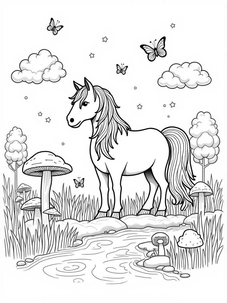 You’ll find a magical scene in this coloring page! Imagine a meadow bursting with oversized, colorful mushrooms shaped like lucky horseshoes. Right in the middle, there’s a stunning silhouette of a pony made from lush green grass and vibrant flowers. Its mane flows beautifully, almost like ribbons dancing in the breeze.
