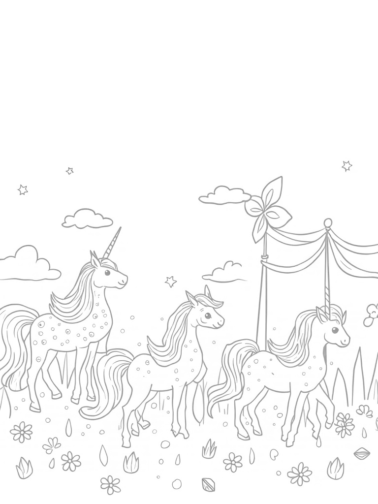 Above, fluffy clouds float lazily across a bright blue sky, while a gentle breeze makes a windmill twirl with shimmering ribbons. The ground sparkles too, with gemstones scattered about and twinkling fireflies adding to the enchanting scene. It’s a perfect setting for kids to let their imaginations run wild as they bring this whimsical world to life with color.