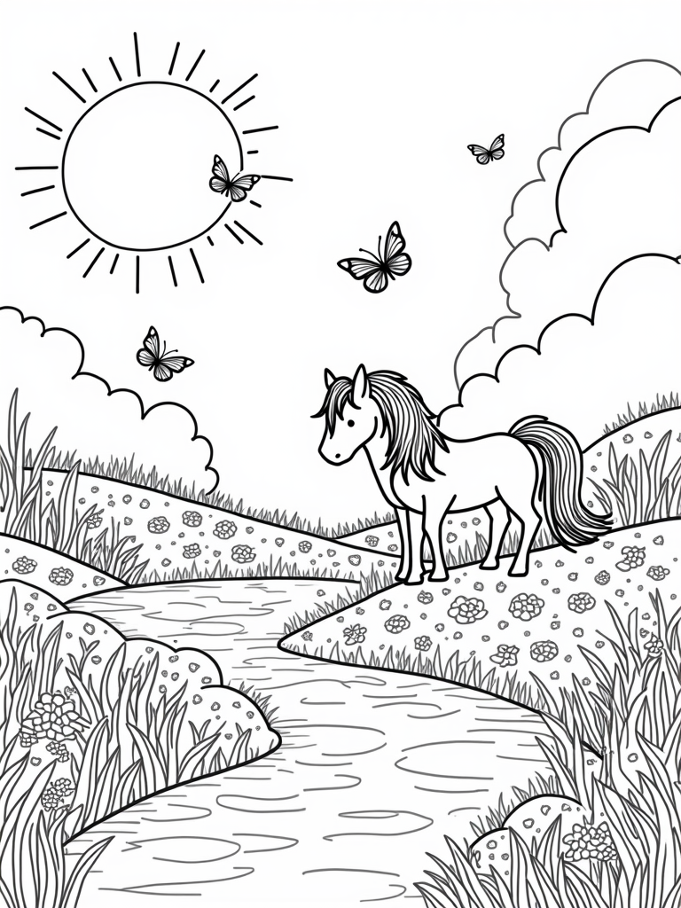 As you color, don’t miss the sparkling stream that winds its way through the meadow. The banks are lined with smooth stones shaped like stars, adding a magical touch. Butterflies with intricate patterns are fluttering around, bringing even more cheer to this delightful landscape. And let’s not forget the giant sun in the background, smiling down and casting playful shadows everywhere!