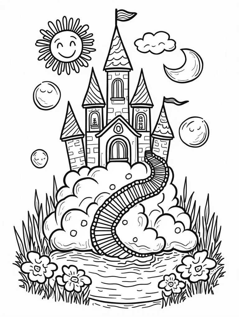 Imagine a dreamy castle sitting on a soft, fluffy cloud! The castle has colorful turrets that twist up towards the sky like rainbow ice cream cones. Below, a winding staircase made of candy canes leads to a huge, cheerful sun that seems to smile down on everything. Nearby, there's a sparkling pond that mirrors all the bright colors of the castle, and it's surrounded by giant flowers with silly faces that are sure to make you giggle.
